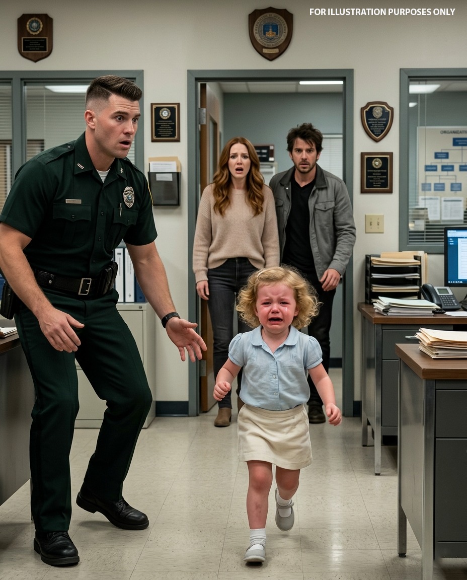 The automatic doors of the police station slid open with a soft mechanical sound, letting in a rush of cold winter air along with a family that looked like they hadn’t slept in days. The father walked in first, his posture stiff and controlled, while the mother followed closely behind, one arm wrapped protectively around a tiny girl whose swollen eyes and tear-streaked cheeks told a story long before anyone spoke.
