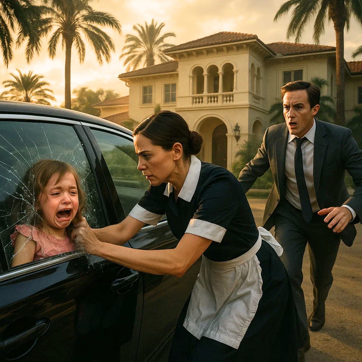 On the porch, Elena, the housemaid, carried a basket of freshly folded sheets. At first, she thought she heard the rustle of branches in the wind. Then a faint thump—then another. She turned and froze. Sophie’s small hands were pressed against the car window, her face red and tear-streaked.
