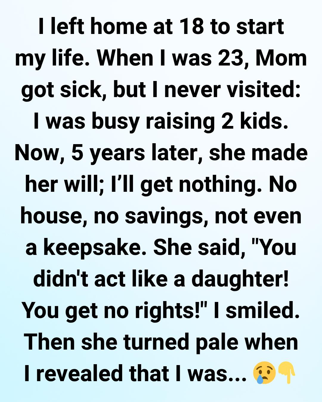 When I was 23, Mom got sick, but I never visited: I was busy raising 2 kids and facing my own struggles. Now, 5 years later, she made her will; I’ll get nothing. No house, no savings, not even a keepsake.