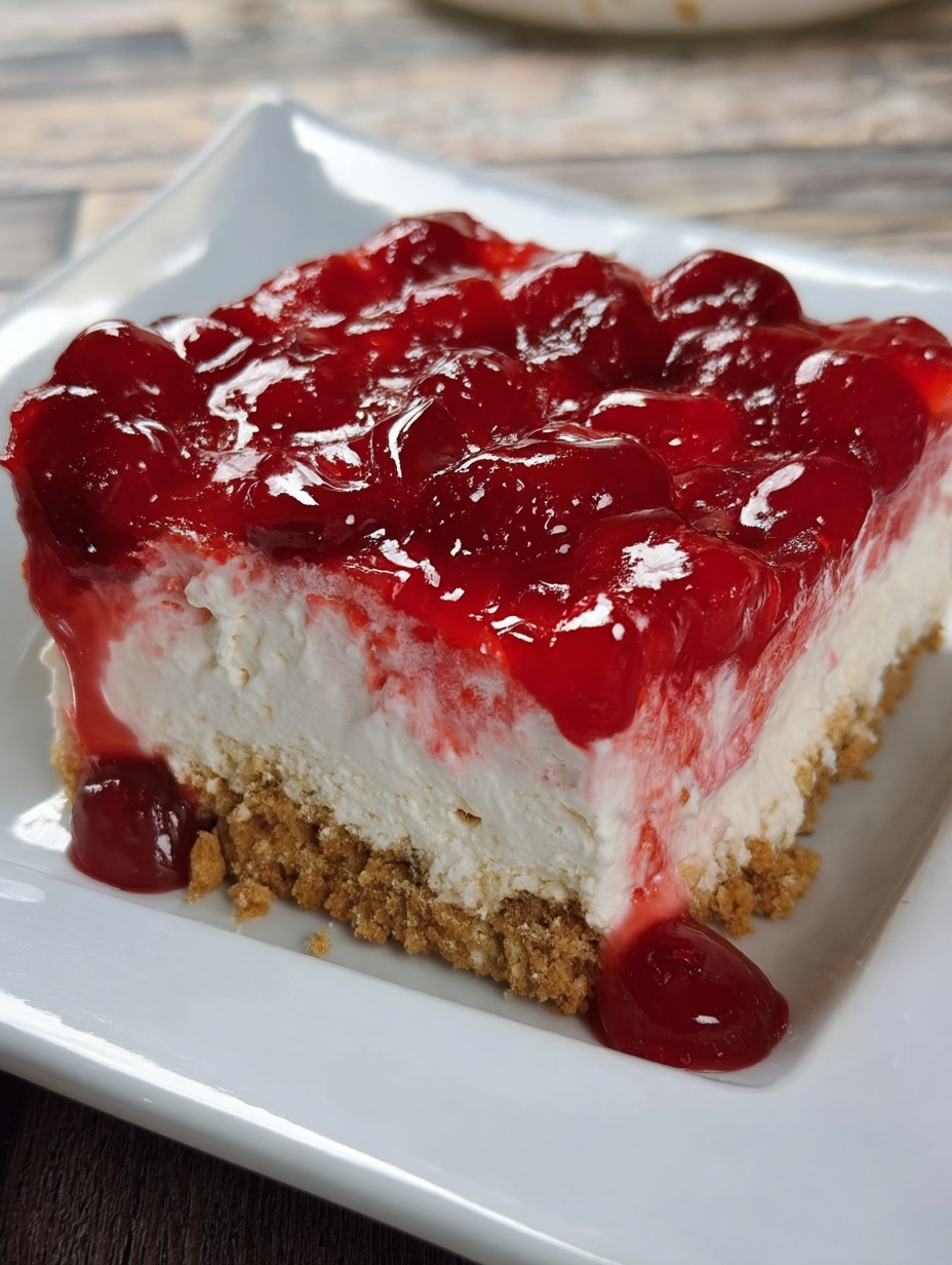 Craving a dessert that’s as effortless as it is indulgent? These No-Bake Cherry Cheesecake Bars deliver all the rich, creamy goodness of traditional cheesecake without ever turning on the oven. Featuring a buttery graham cracker crust, a fluffy cream cheese filling, and a sweet-tart cherry topping, this treat is a guaranteed crowd-pleaser — perfect for potlucks, holidays, or just a sweet treat after dinner.