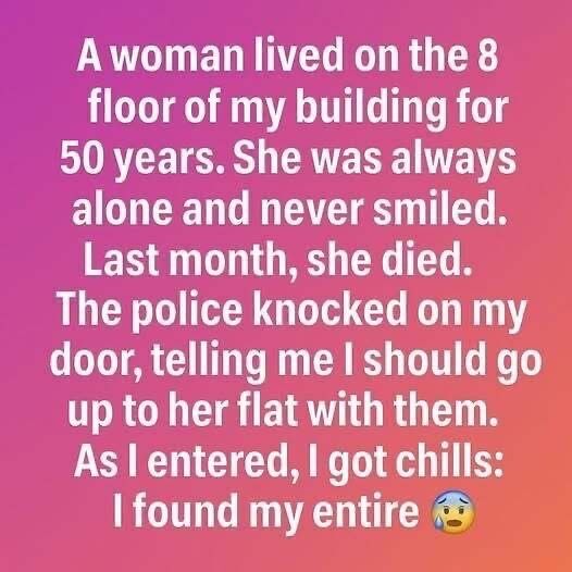 For fifty years, she lived quietly on the eighth floor of our building. She rarely spoke, never smiled, and kept entirely to herself. People came and went, but she remained—an isolated figure who seemed almost invisible, a ghost of the everyday life around her. Few knew her name, fewer still had ever been inside her apartment.